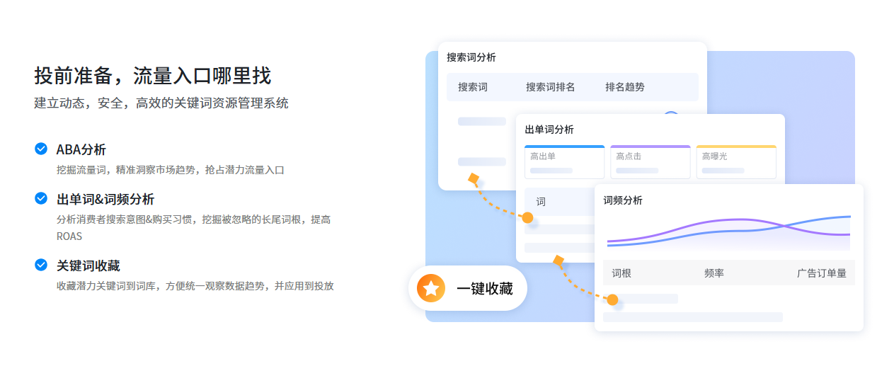 一站式广告智能投放。赛狐ERP覆盖亚马逊、TikTok、沃尔玛等主流平台的广告管理,构建了“投前-投中-投后”全流程闭环优化体系。投前通过ABA(亚马逊品牌分析)、出单词频分析、以词拓词等方式精准挖掘流量词与长尾词根,搭建动态高效的关键词库;投中以产品为中心批量搭建广告矩阵,支持快测广告(基于控制变量法快速测试投放效果)与7×24小时自动化优化,实现海量广告的高效管理;投后借助广告全景仪(整合20+广告数据分析模型)、产品广告透视、广告操作复盘等工具,多维度分析数据、定位问题、沉淀成功经验,反哺投放策略优化。